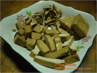 4、 炒鍋加熱,加油(少),加入豆干爆炒,兩至面微黃,起鍋。(A料)
