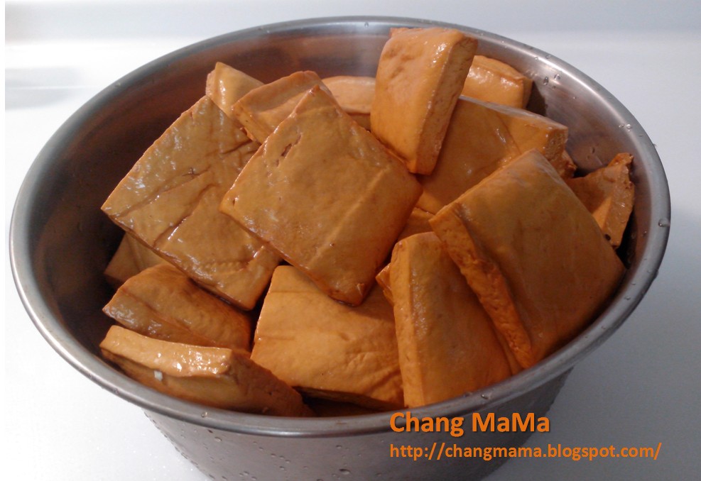 3、豆皮軟透後取出,擠去多餘的水分,並切成適當大小。加適量的醬油、素沙茶醬和糖,用小火慢慢的滷。